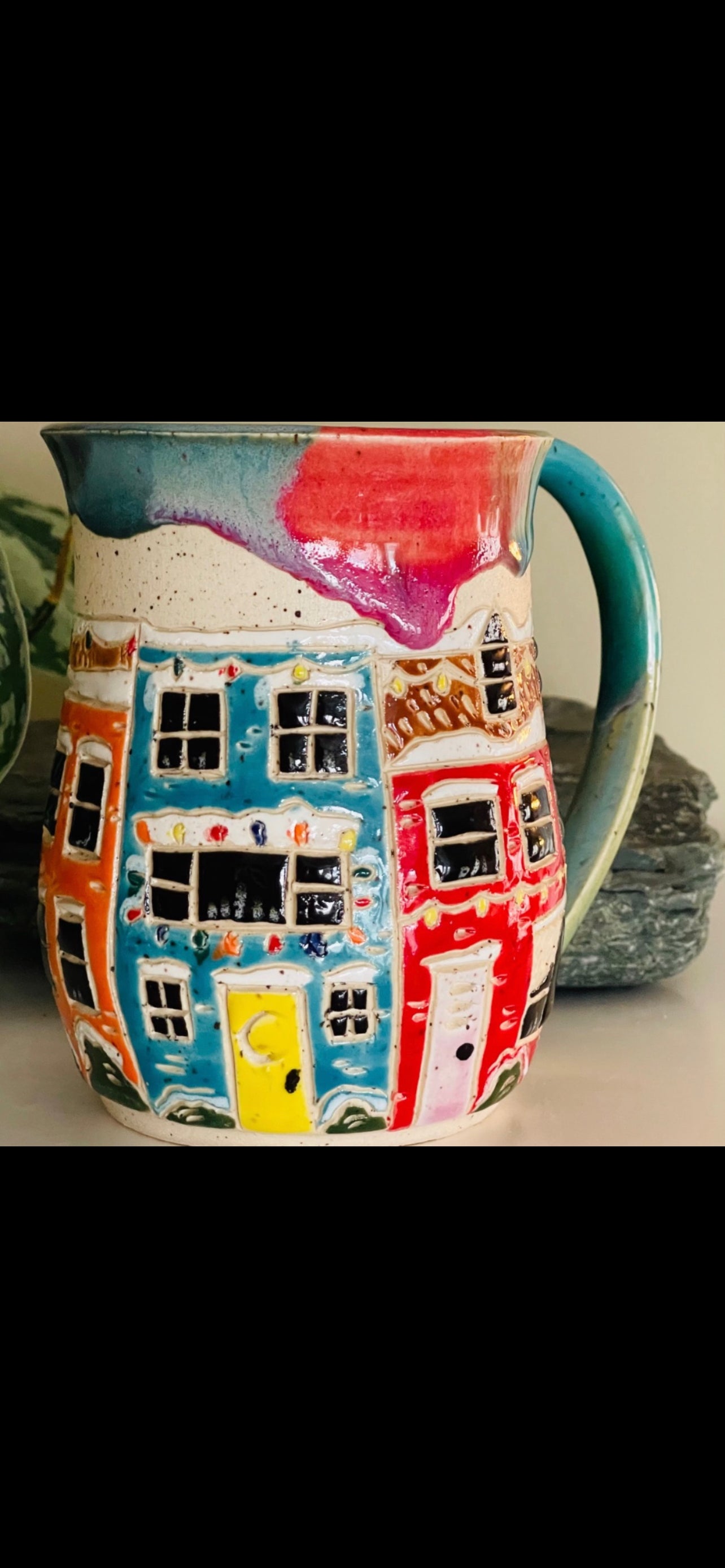 Colourful rim and liner, exact combo will vary. Mug shape may vary slightly. You are ordering a made to order, functional piece of art. Each piece is unique and one of a kind.