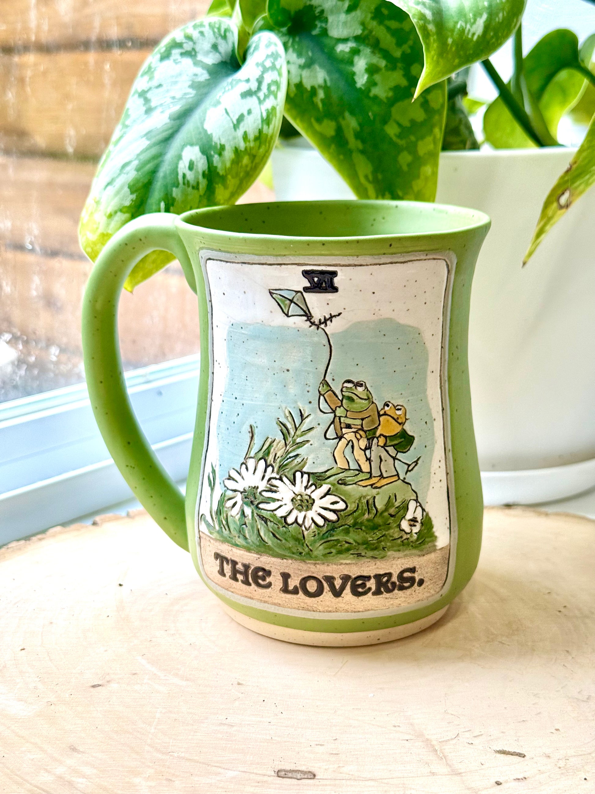 You are ordering a Frog & Toad PRE-ORDER piece. You can choose a mug (w handle), tumbler (w.o handle), Travel mug (w lid/w.o handle) or spoon rest (5” across w character design, will not include tarot details).