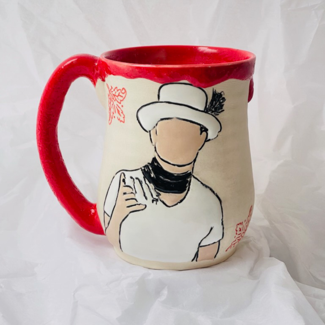 Red rim and clear liner. Mug shape may vary slightly. Dishwasher and microwave safe.