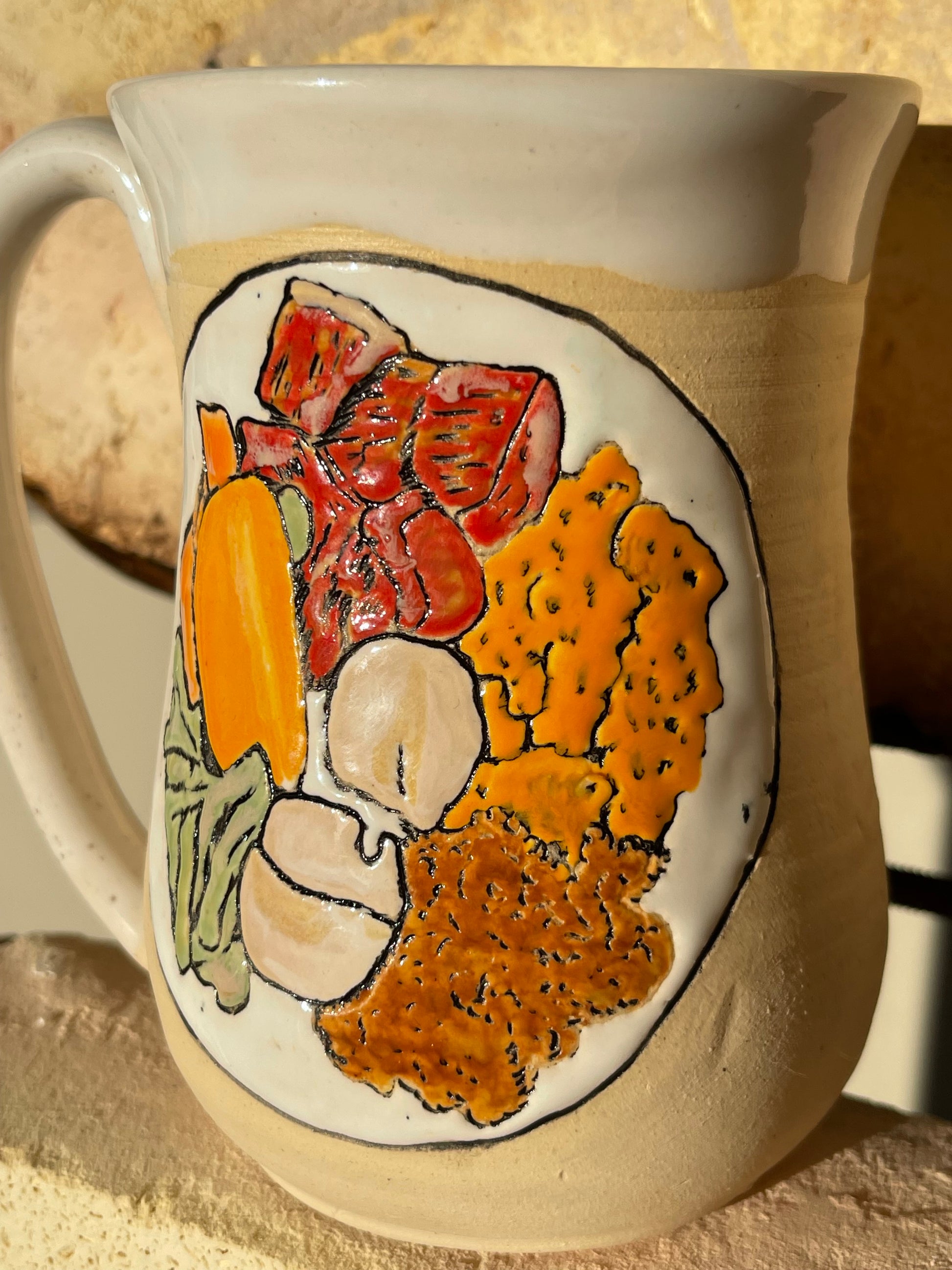 Clear rim and liner, exact combo will vary. Mug shape may vary slightly. You are ordering a made to order, functional piece of art. Each piece is unique and one of a kind.