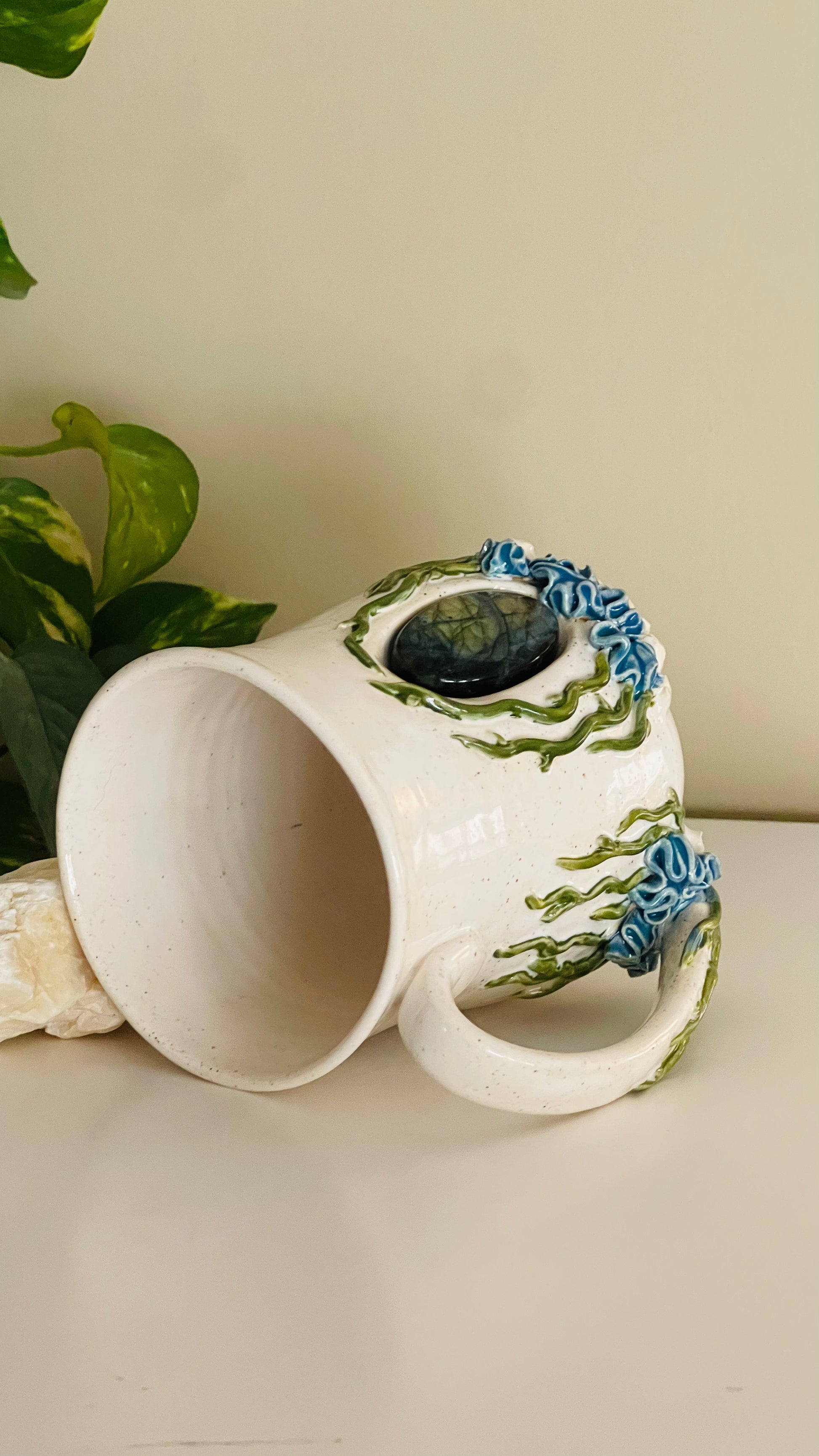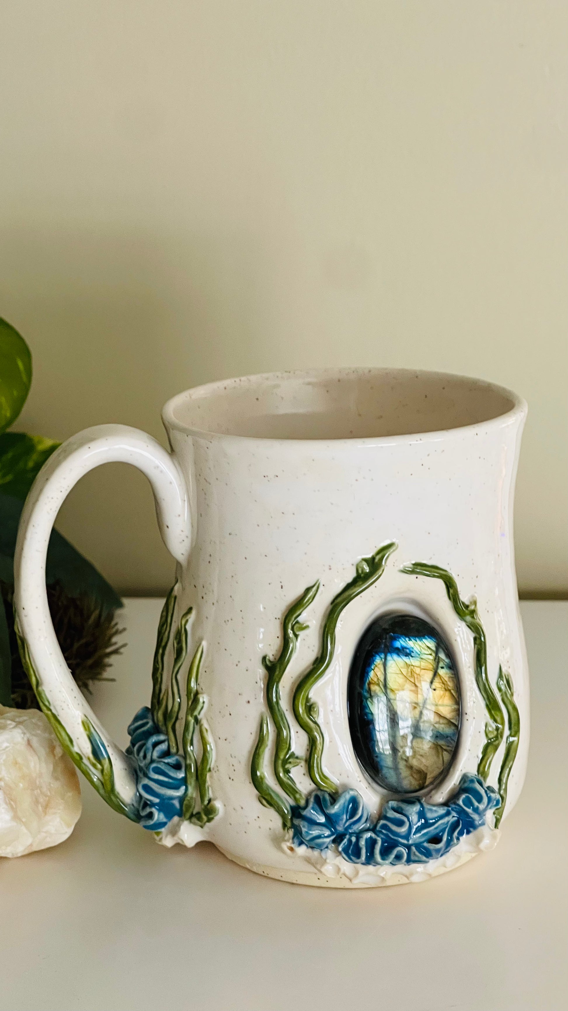 Inspired by the flash in the labradorite, this stone has the power to act as a talisman + guide. A beautiful example of my favourite stone, surrounded by a seaweed and flora.