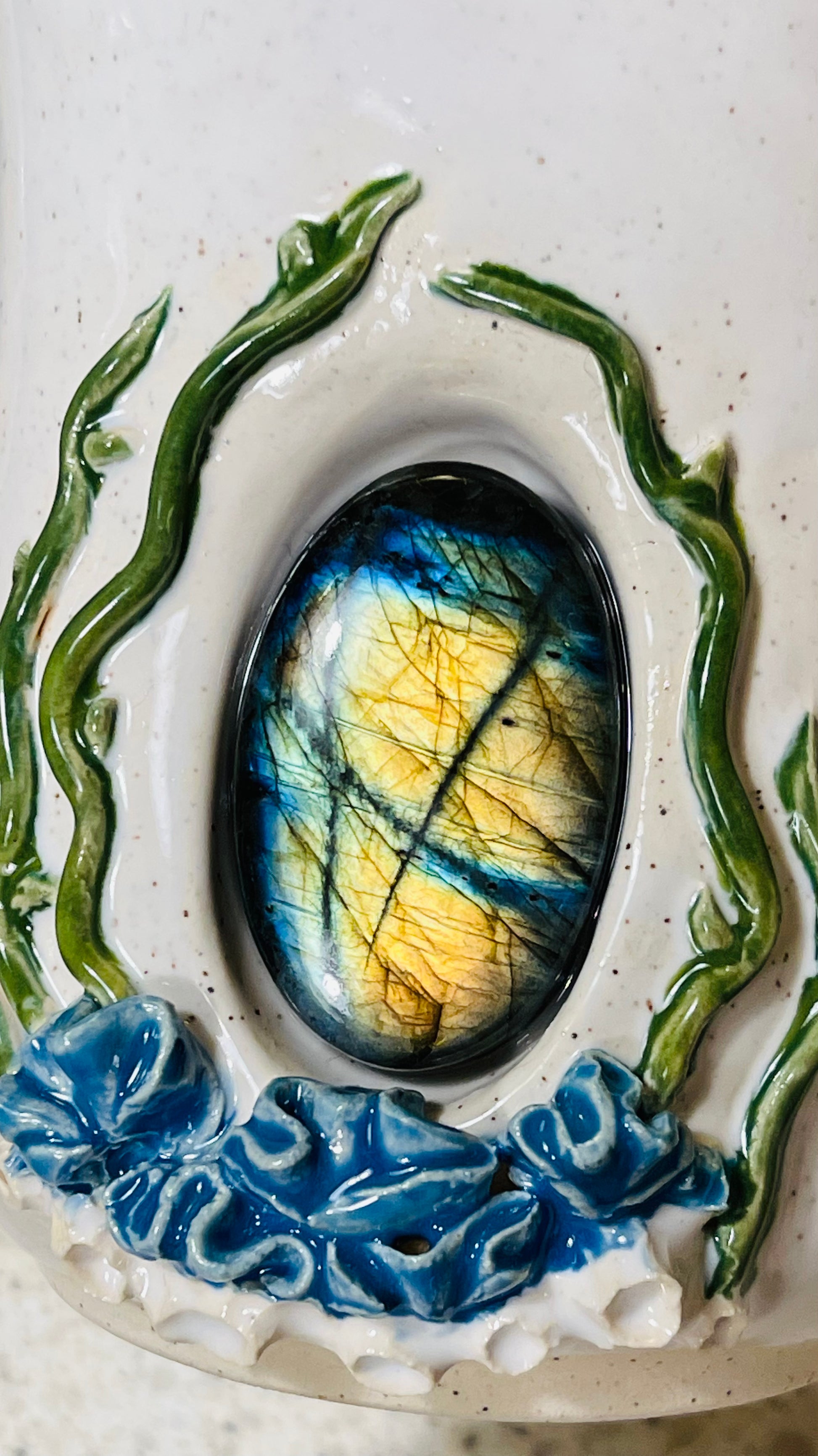 Hand sculpted and glazed, this piece of functional art includes a gorgeous piece of Labradorite, full of flash from nearly every angle.