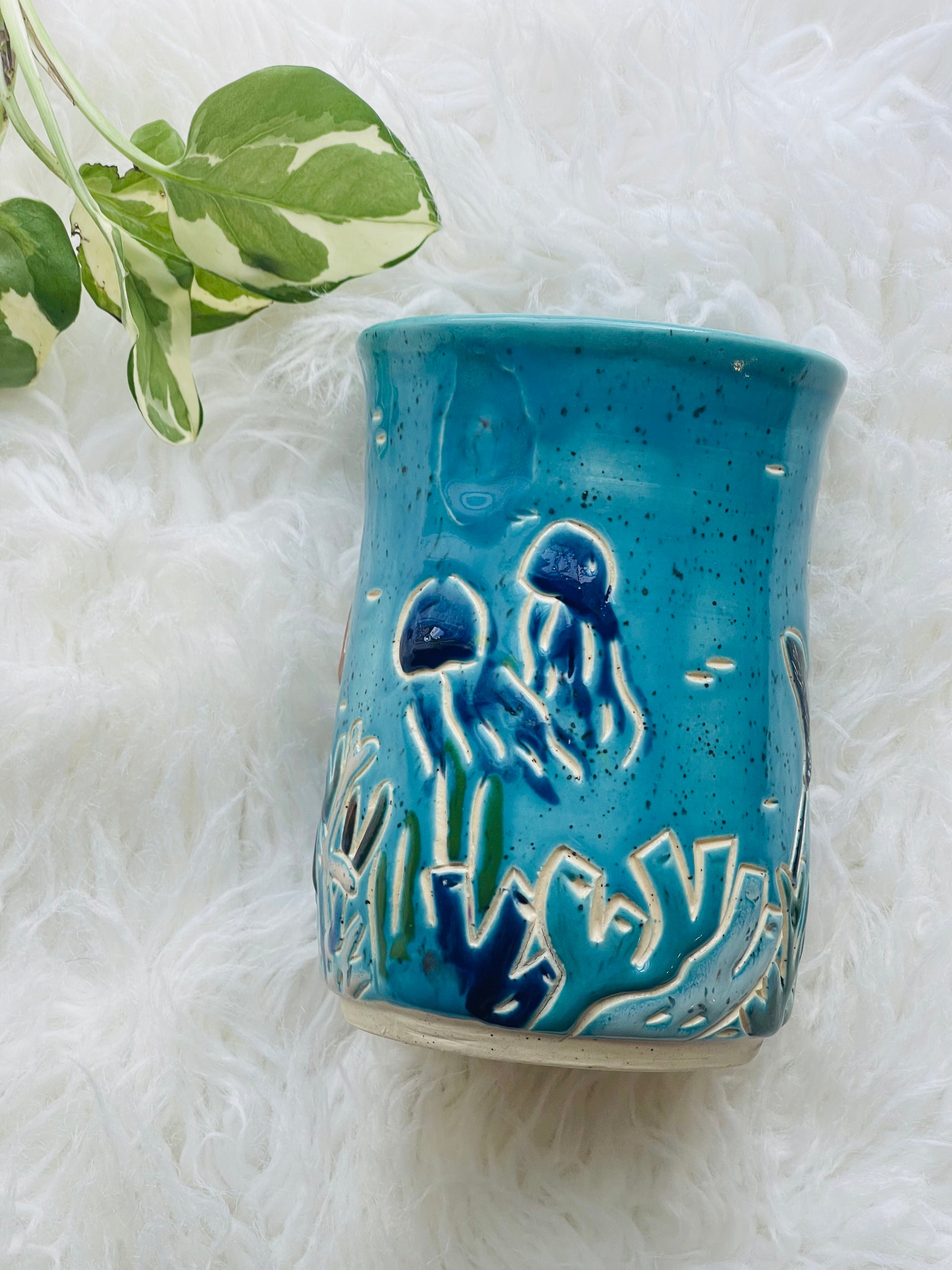 Okay, aside from the squealing (hopefully by both of us!), there are a few things you should know. Your mug/tumbler will be approximately 16oz, give or take an ounce or 2. Your piece is technically dishwasher and microwave safe (IF IT DOESN'T HAVE GOLD ON IT), but let's remember, this is not just a mug. This is a piece of art. To ensure your art stays as gorgeous as the day it arrived for years to come, I recommend handwashing and drying gently. Do not let your piece soak in dirty dish water, it will stain the bare ceramic over time.