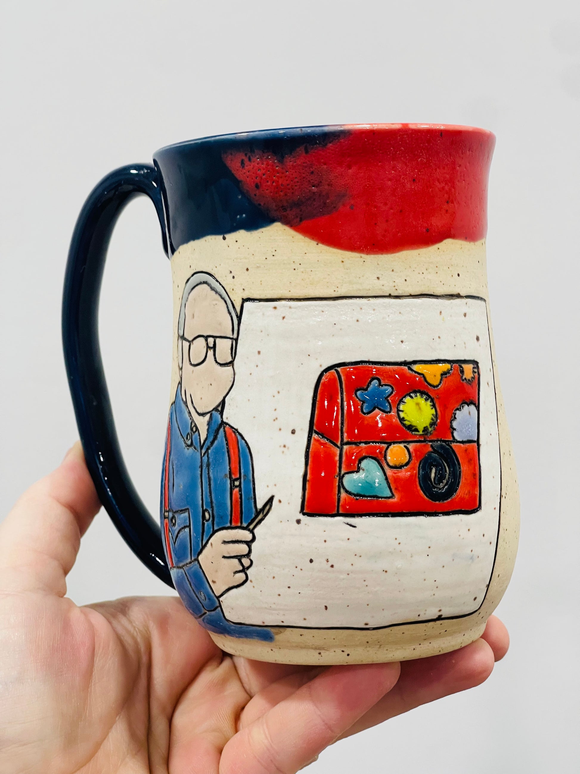 Colourful rim and liner, exact combo will vary. Mug shape may vary slightly.