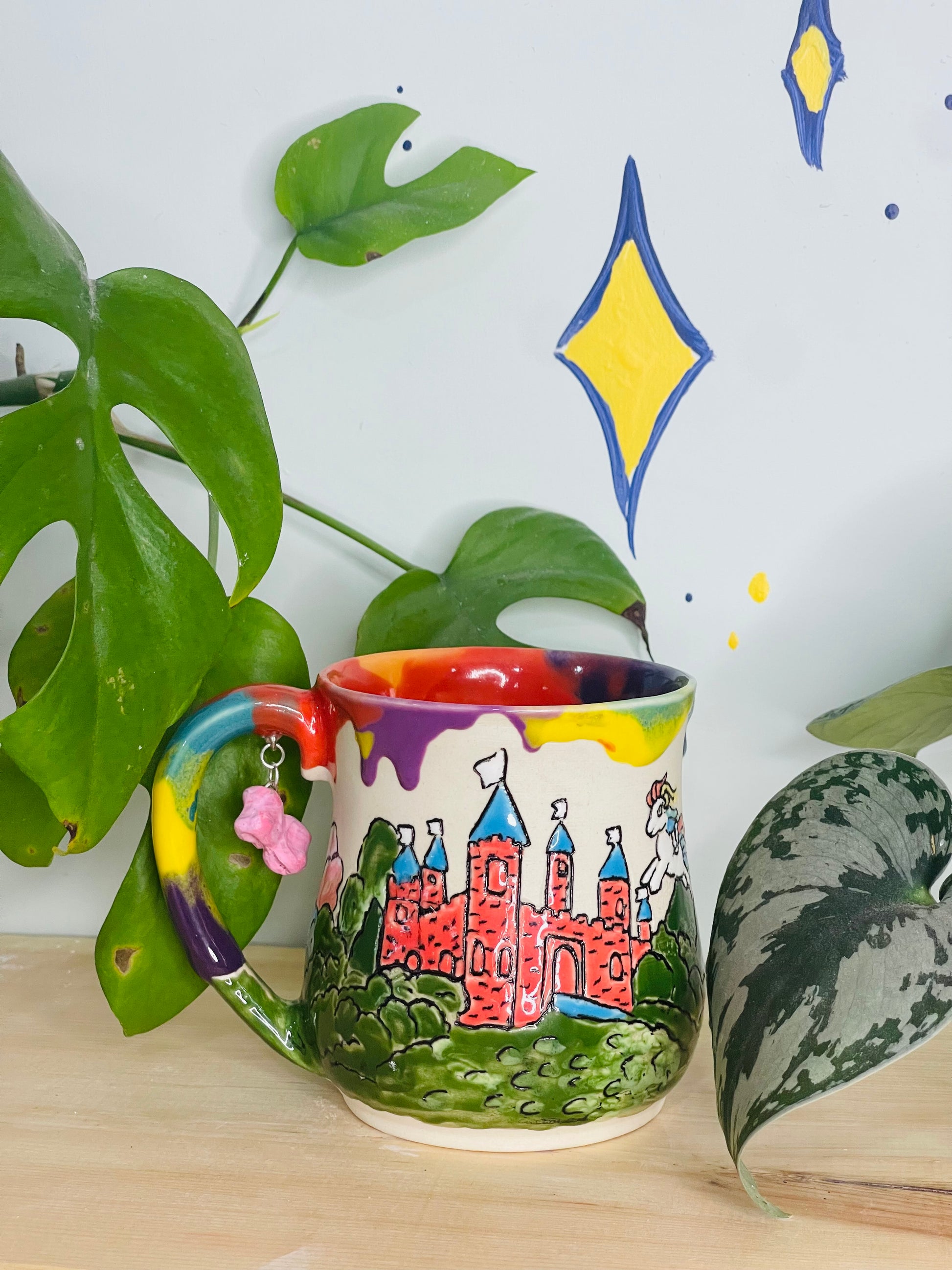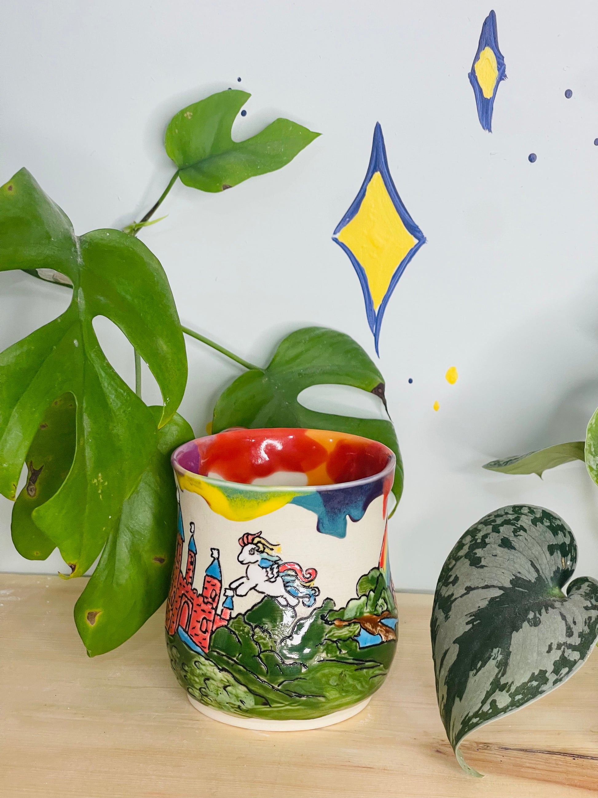 Colourful rim and liner, exact combo will vary. Mug shape may vary slightly. You are ordering a made to order, functional piece of art. Each piece is unique and one of a kind.