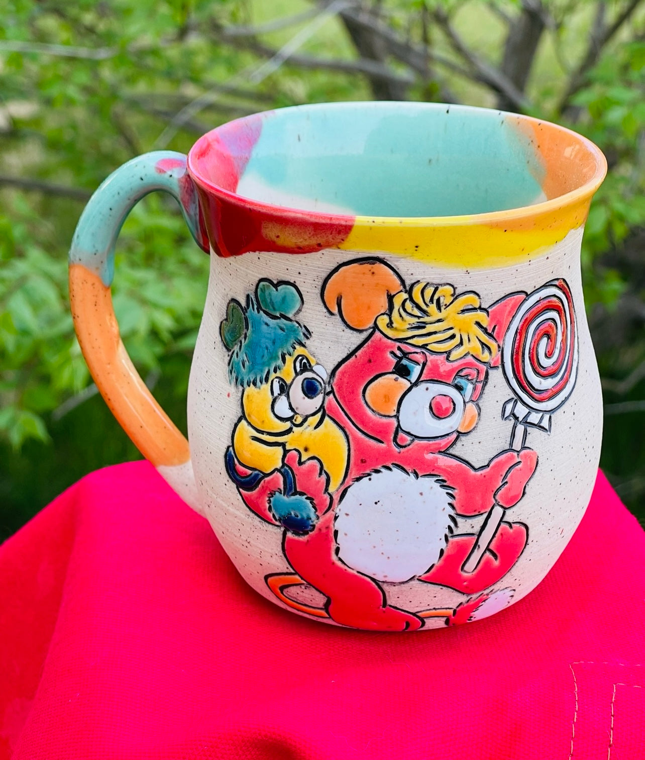Colourful rim and clear liner. Mug shape may vary slightly. Spoon rest is approx 5" across and 3” across for the teabag rest.