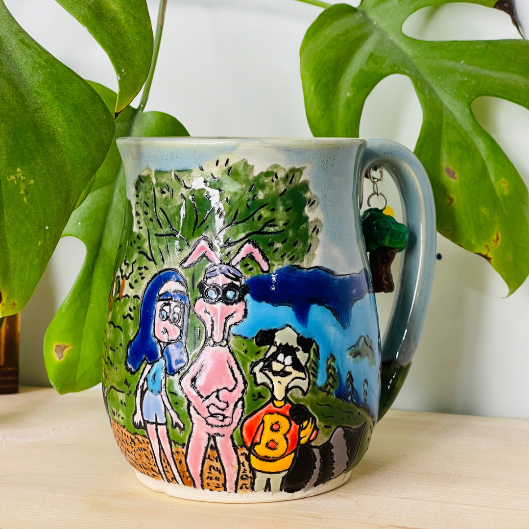 Colourful rim and liner, exact combo will vary. Mug shape may vary slightly. You are ordering a made to order, functional piece of art. Each piece is unique and one of a kind.