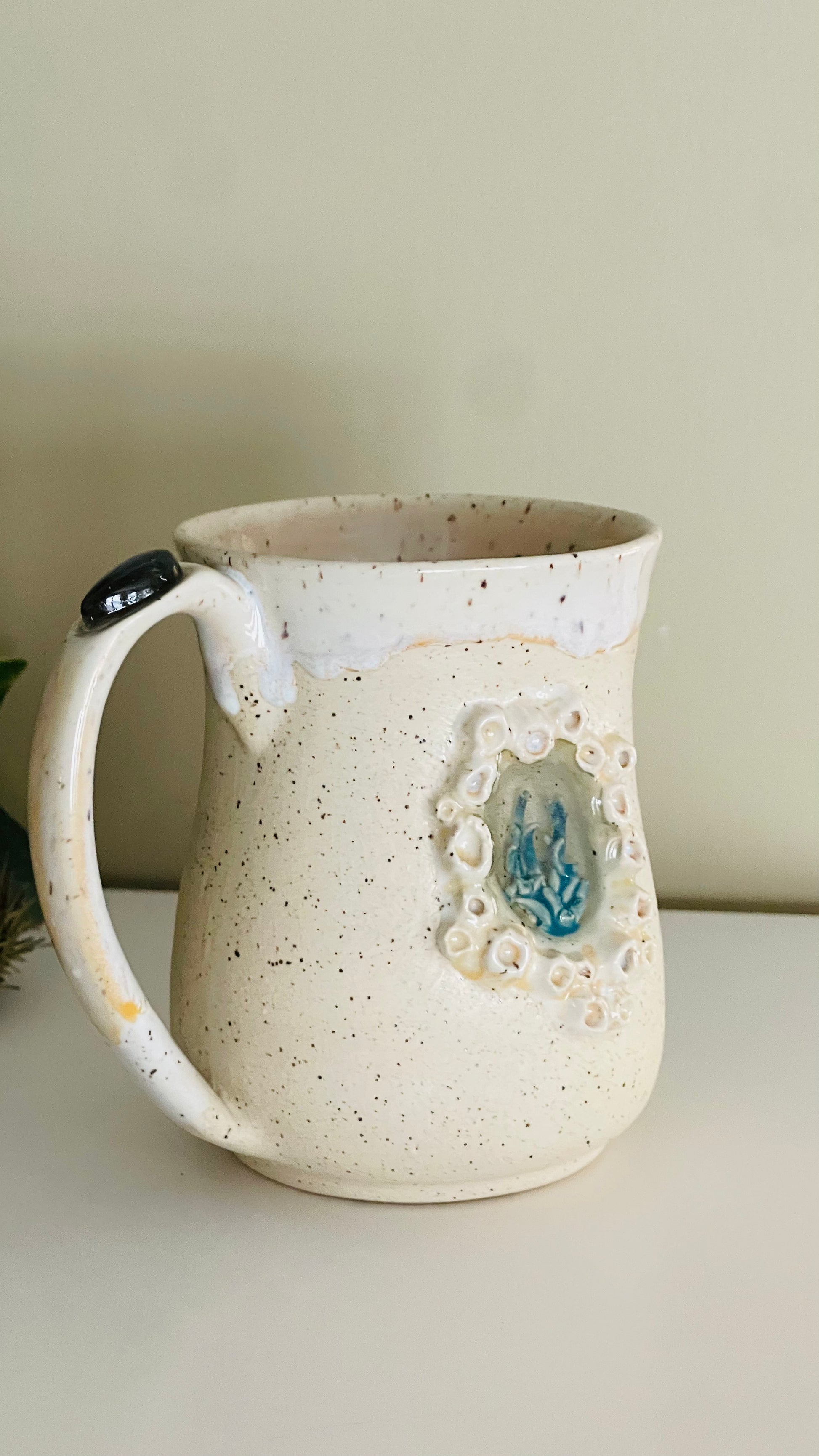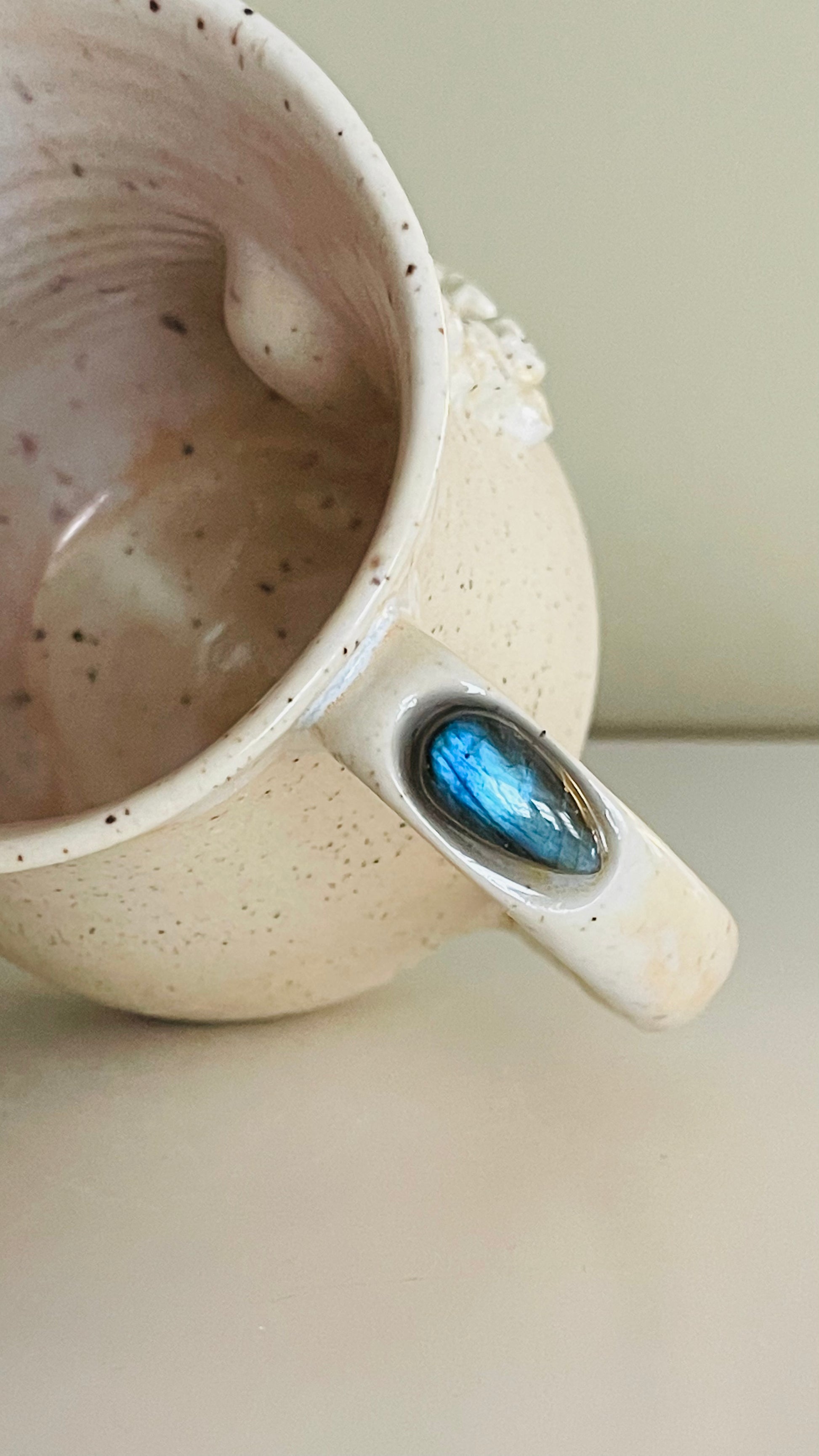 A delicately sculpted patch of seaweed, hand glazed in an array of colours that evoke the sea. This piece of functional art includes a piece of labradorite set in the thumb rest.